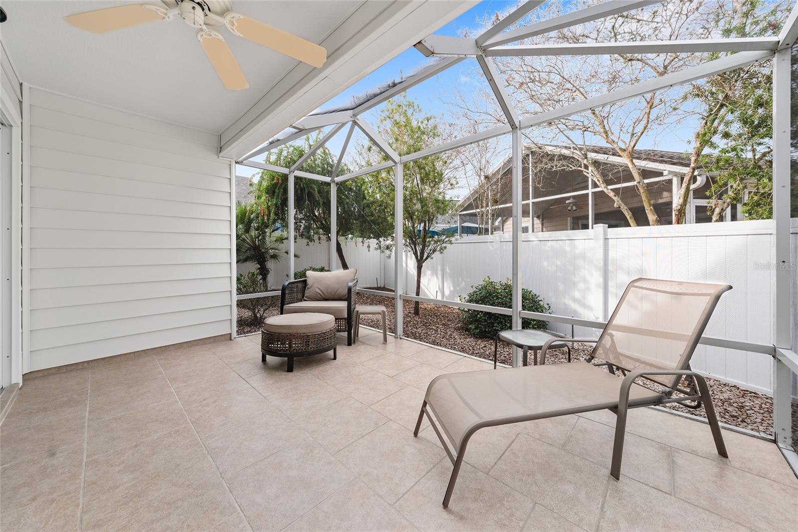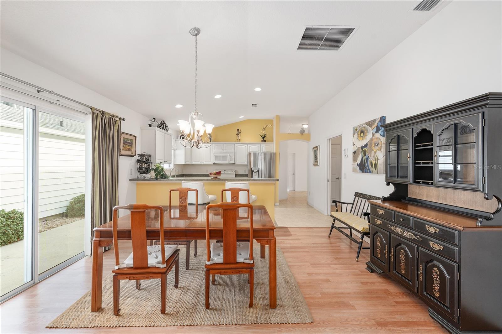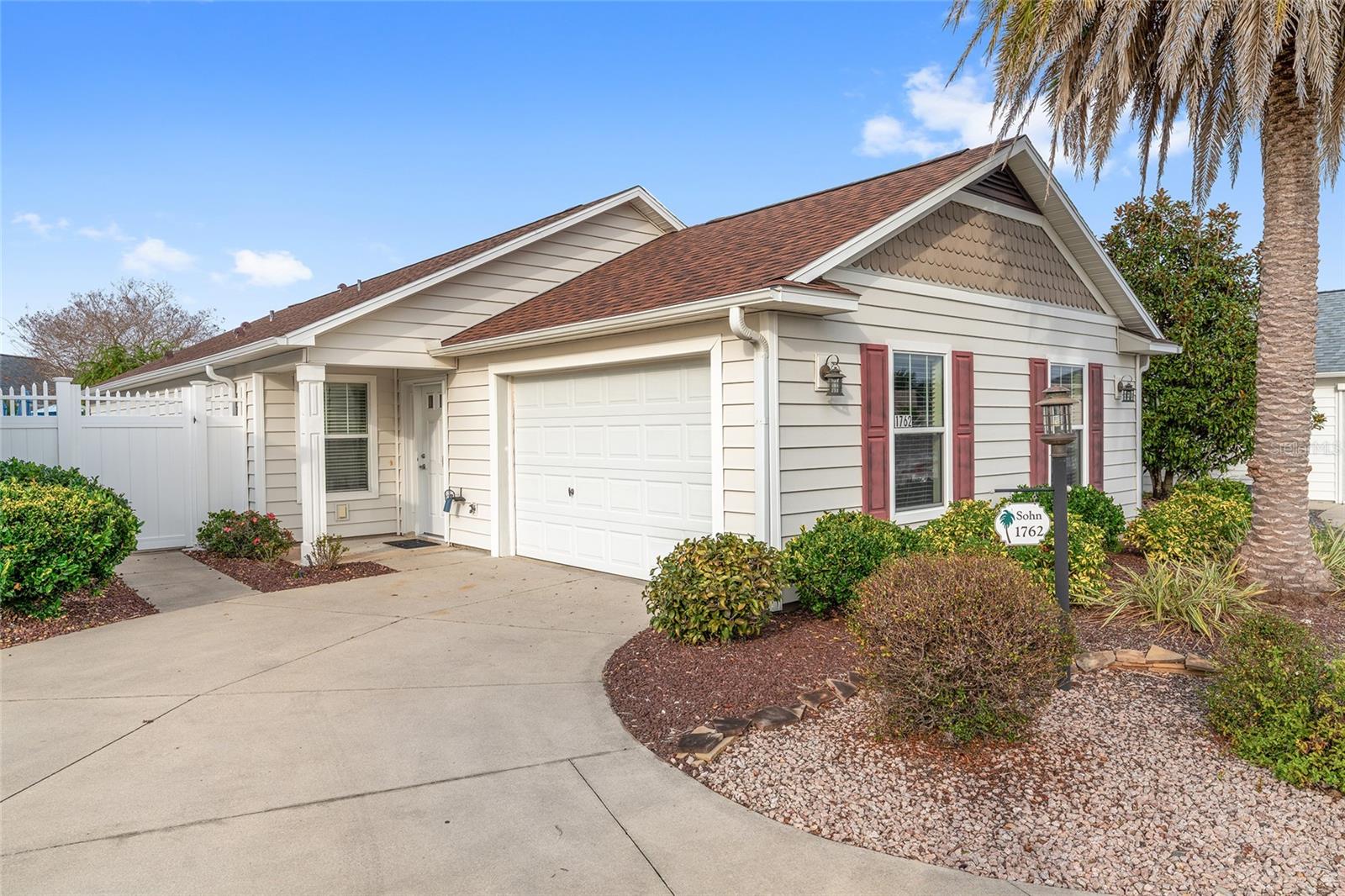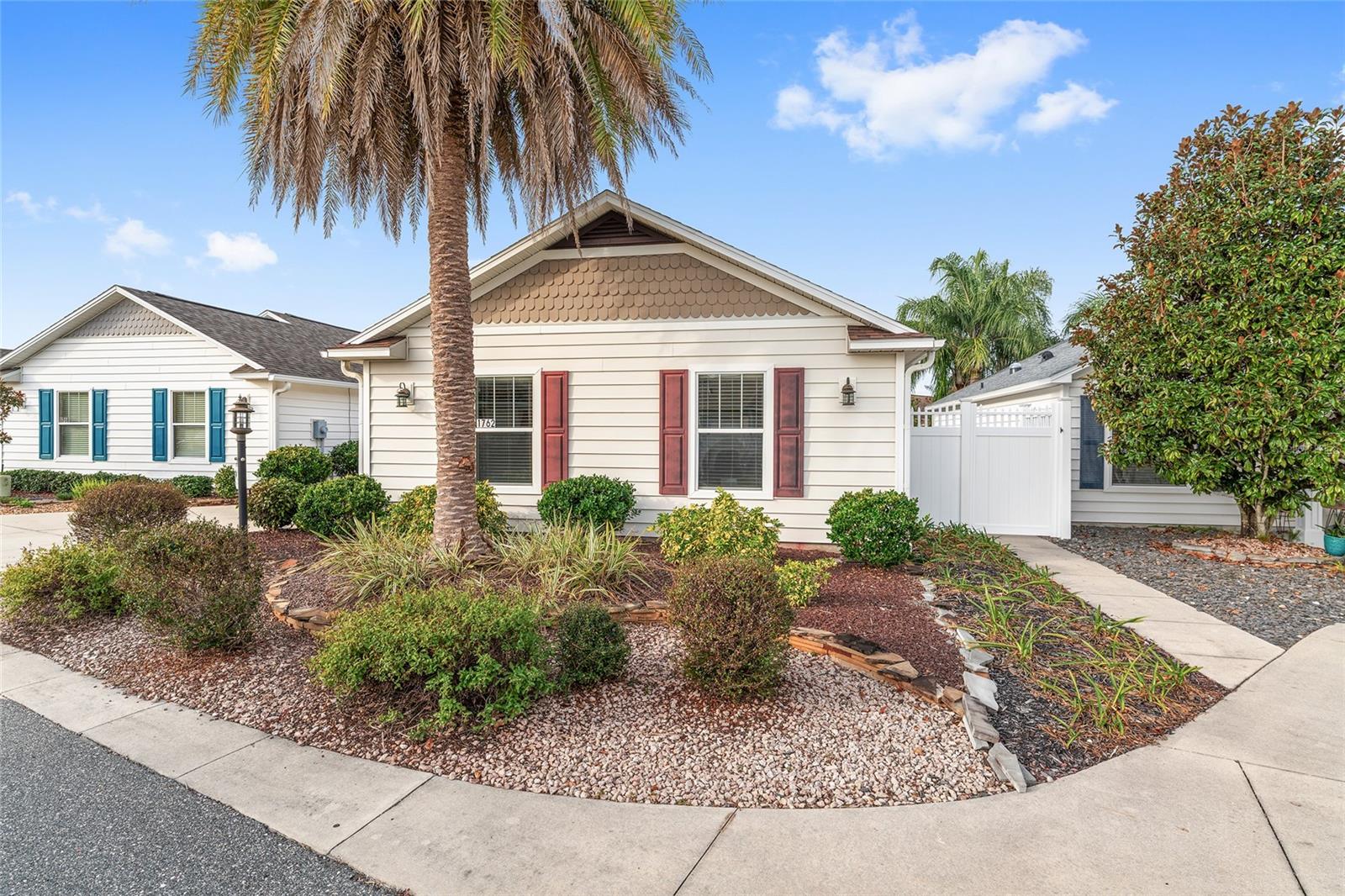 Experience refined Florida living in this TURNKEY, FURNISHED, immaculately maintained courtyard villa nestled in the highly sought-after VILLAGE OF PENNECAMP. This prime location is situated between SUMTER LANDING and BROWNWOOD PADDOCK SQUARE- a golf cart ride away from shopping, dining, and entertainment. Designed for both comfort and style, this OPEN-CONCEPT floor plan seamlessly connects the living room and dining area to the SPACIOUS KITCHEN which features abundant WHITE CABINETRY with PULLOUTS and a convenient BREAKFAST BAR – ideal for everyday living and entertaining. This 3-bedroom, 2-bath residence features soaring VOLUME CEILINGS and a BRIGHT, OPEN LAYOUT with NO CARPETING throughout. Laminate flooring and ceramic tile add a modern, cohesive feel. Recent upgrades—including a 2023 ROOF and 2019 HVAC—provide lasting peace of mind. Step outside to your FULLY FENCED, PRIVATE PATIO WITH BIRDCAGE—an inviting retreat ideal for morning coffee, evening relaxation, or hosting guests. This home is less than a 10 minute GOLF CART RIDE to 9 EXECUTIVE GOLF COURSES AND 2 CHAMPIONSHIP GOLF COURSES. With resort-style pools, recreation centers, tennis, pickleball, country clubs, dining, and shopping-- an exceptional lifestyle in one of The Villages’ most desirable locations awaits you! A 2015 YAMAHA GOLF CART with under 3,000 MILES is included. Garage can accommodate one car, a golf cart, and has storage cabinet.