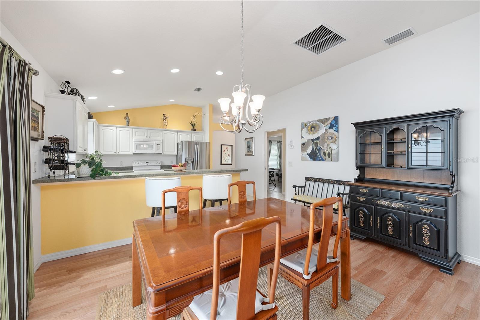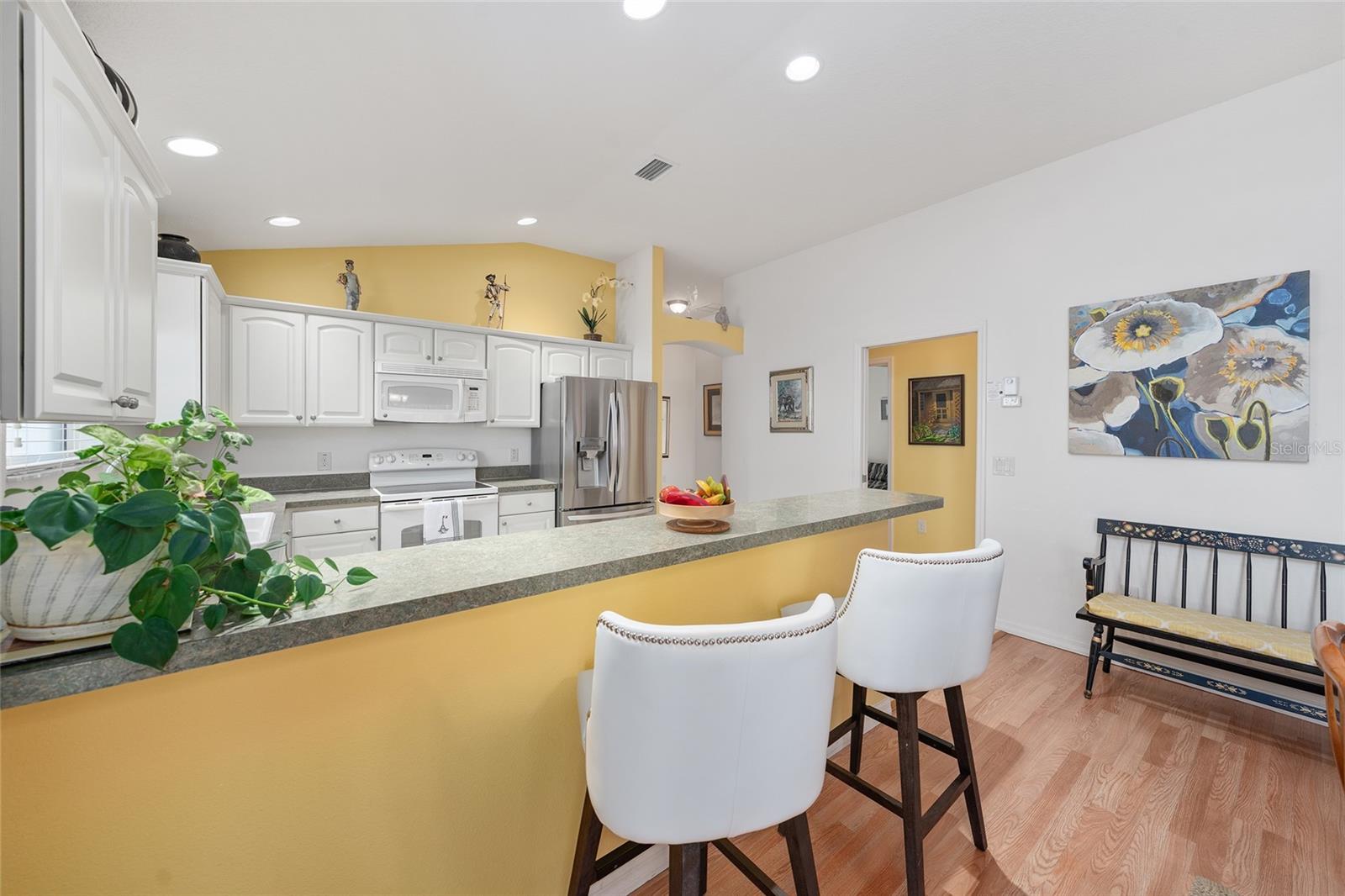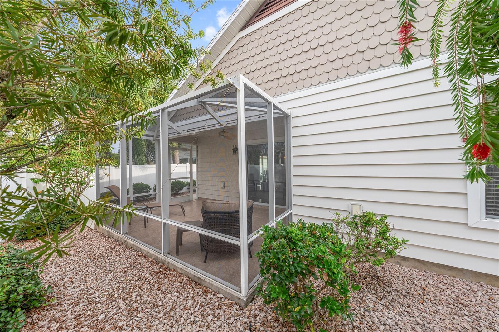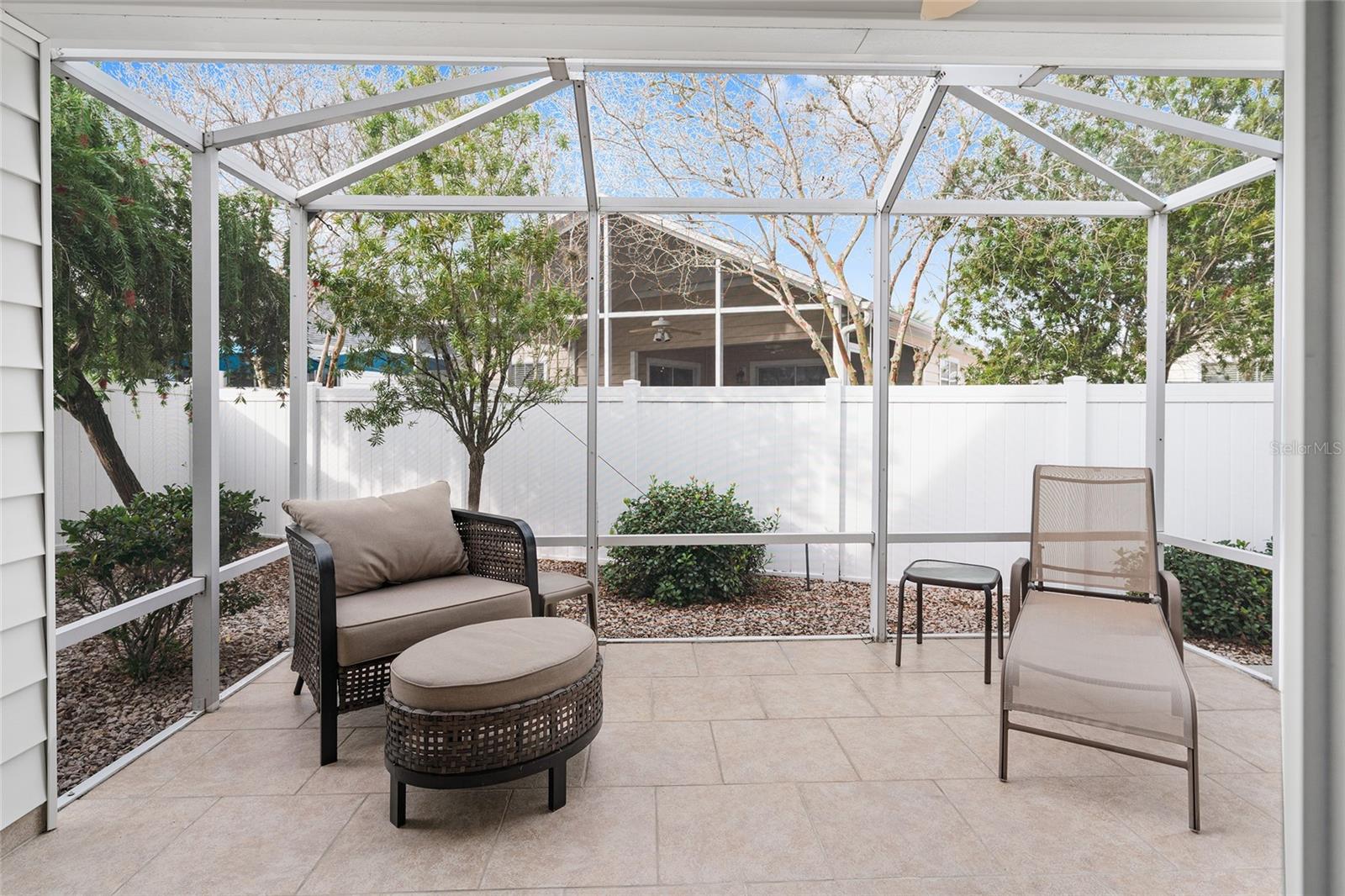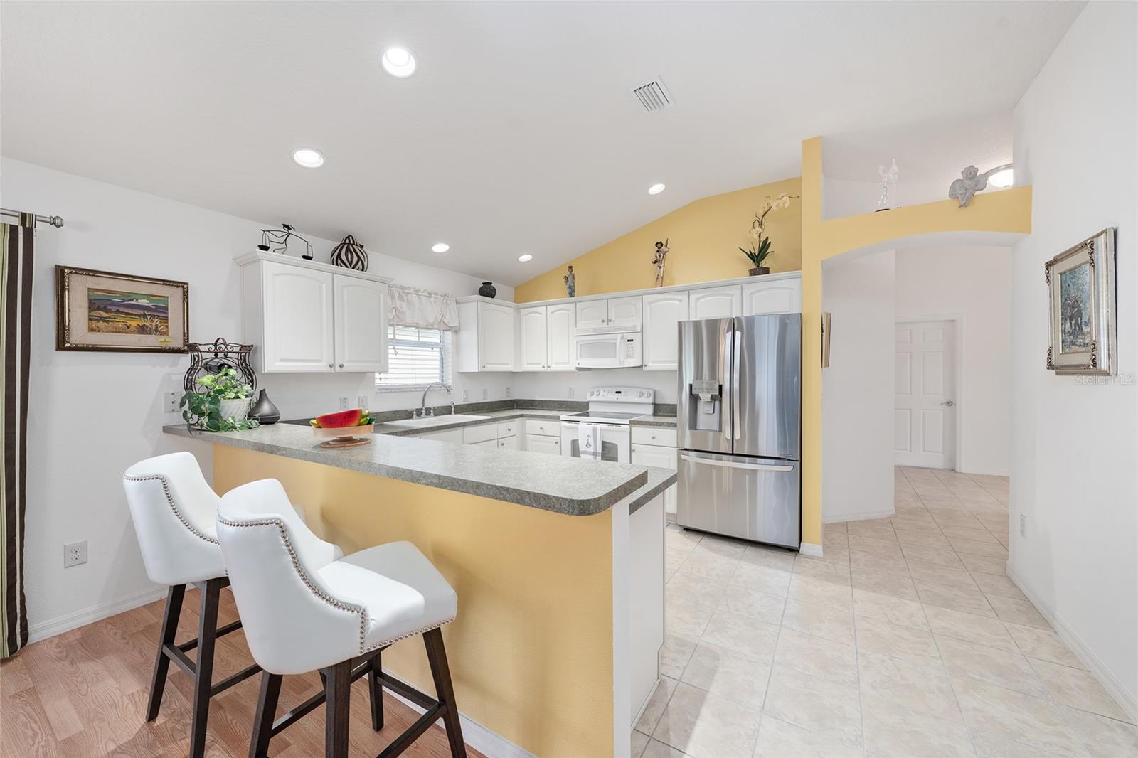 Experience refined Florida living in this TURNKEY, FURNISHED, immaculately maintained courtyard villa nestled in the highly sought-after VILLAGE OF PENNECAMP. This prime location is situated between SUMTER LANDING and BROWNWOOD PADDOCK SQUARE- a golf cart ride away from shopping, dining, and entertainment. Designed for both comfort and style, this OPEN-CONCEPT floor plan seamlessly connects the living room and dining area to the SPACIOUS KITCHEN which features abundant WHITE CABINETRY with PULLOUTS and a convenient BREAKFAST BAR – ideal for everyday living and entertaining. This 3-bedroom, 2-bath residence features soaring VOLUME CEILINGS and a BRIGHT, OPEN LAYOUT with NO CARPETING throughout. Laminate flooring and ceramic tile add a modern, cohesive feel. Recent upgrades—including a 2023 ROOF and 2019 HVAC—provide lasting peace of mind. Step outside to your FULLY FENCED, PRIVATE PATIO WITH BIRDCAGE—an inviting retreat ideal for morning coffee, evening relaxation, or hosting guests. This home is less than a 10 minute GOLF CART RIDE to 9 EXECUTIVE GOLF COURSES AND 2 CHAMPIONSHIP GOLF COURSES. With resort-style pools, recreation centers, tennis, pickleball, country clubs, dining, and shopping-- an exceptional lifestyle in one of The Villages’ most desirable locations awaits you! A 2015 YAMAHA GOLF CART with under 3,000 MILES is included. Garage can accommodate one car, a golf cart, and has storage cabinet.